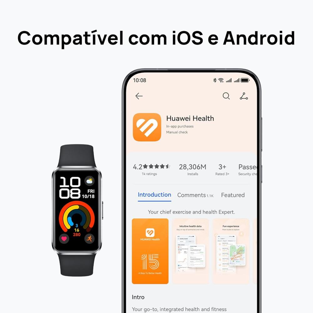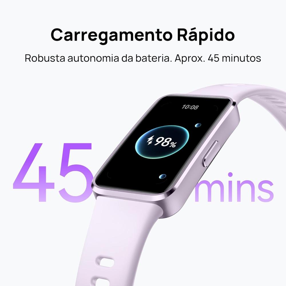 - Ultrafino a 8,99 mm,ultraleve a 15 g,e combinado com pulseiras de fluoroelastômero amigáveis à pele. A HUAWEI Band 10 relogio smartwatch oferece uma sensação leve.